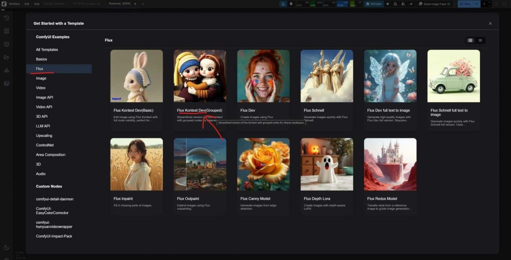 The workflow is based on the default workflow provided by the ComfyUI team, so if you updated ComfyUI as per above recommendation you should see that in the Templates. You can start to use the one called βFlux Kontext Dev (Grouped)β