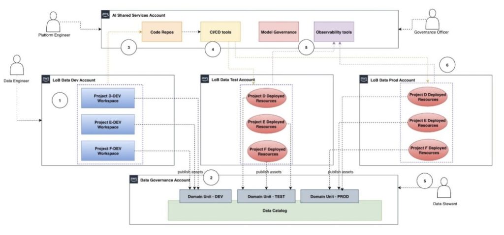 LOB dev account – This account hosts the development AI projects for a given LOB. Users such as data scientists use SageMaker Unified Studio tools to experiment and build and unit test AI project pipelines and models. Unit tested AI project pipelines and models are then promoted using CI/CD to corresponding AI project’s test environment. During this promotion process, the models are also made available in the central model registry in the shared services account for facilitating central model governance and approval workflows.