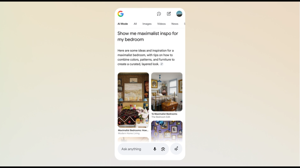 For instance, you might see someone on the street with an aesthetic you like, snap a picture, and ask AI Mode to “show me this style in lighter shades,” Or ask for “retro 50s living room designs” and see what people were sitting on and around 75 years ago. Google pitches the features as a way to replace filters and awkward keywords with natural conversation.