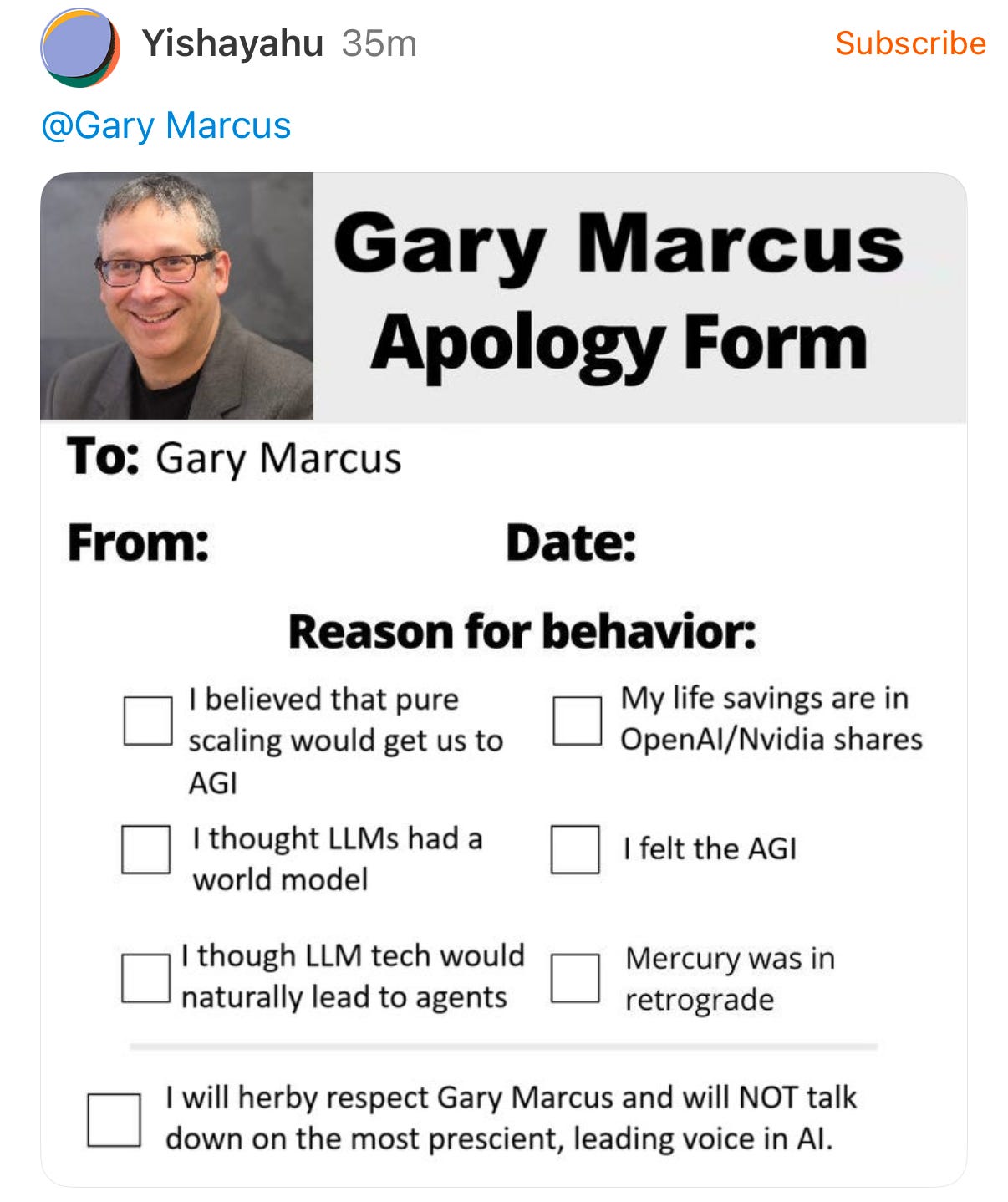 “Gary Marcus was right” memes, none of which reflect well on OpenAI, were everywhere. A reader of this Substack even went to so far to an invent a hilarious Gary Marcus Apology Form.