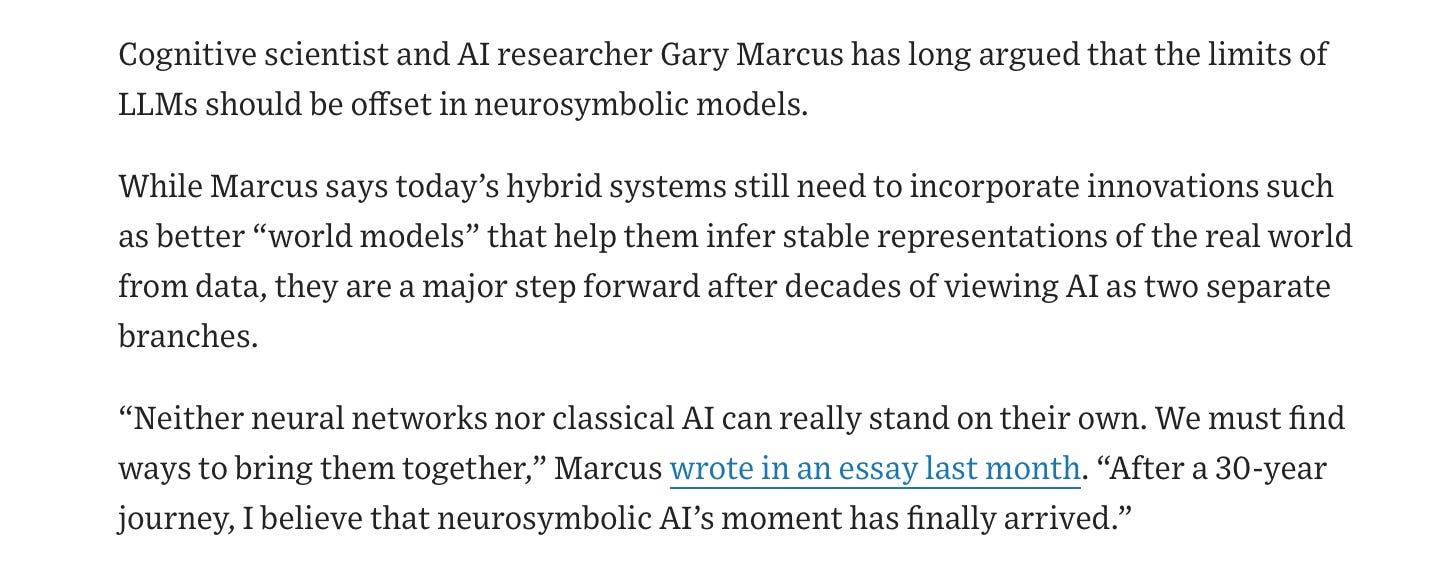 As if Sam’s week couldn’t get worse, columnist Steve Rosenbush at The Wall Street Journal gave me further props, on the topic of neurosymbolic AI, the alternative to LLMs that I long advocated, describing how Amazon was now putting neurosymbolic AI into practice and closing his essay with a pointer to my views and a link to another of this newsletter’s essays.