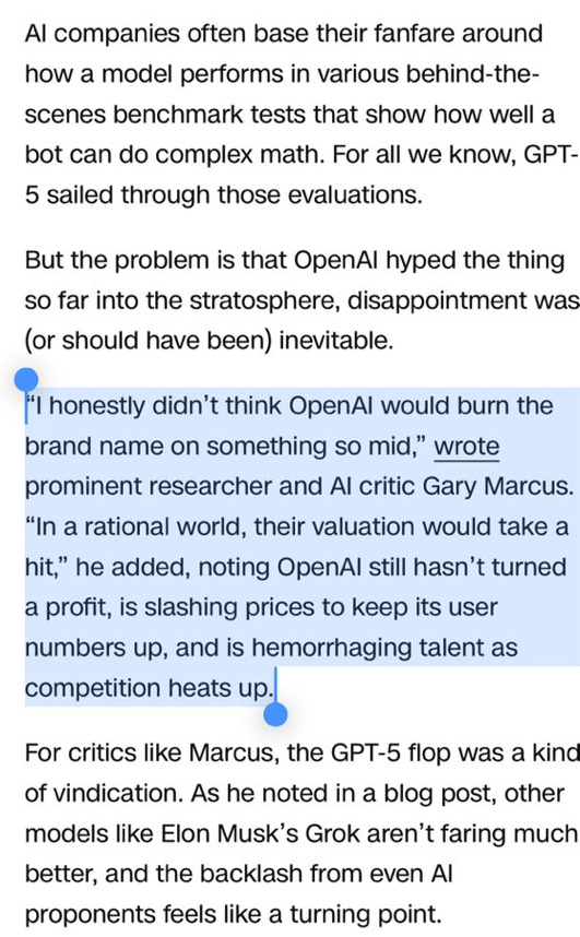 But media coverage is not science, and braggadacio alone cannot yield AGI. What is shocking is that suddenly, almost everywhere all at once, the veil has begun to lift. Over the last week the world woke up to the fact Altman wildly overpromised on GPT-5, with me no longer cast as villain but as hero, which is probably the stuff of Sam’s worst nighmares.