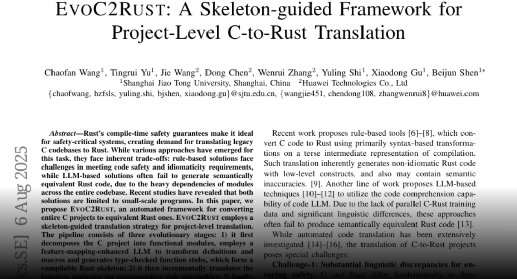 EvoC2Rust is an automated framework that translates entire C projects to Rust using a skeleton-guided approach, combining rule-based and LLM-based methods to improve syntax, semantics, and safety.