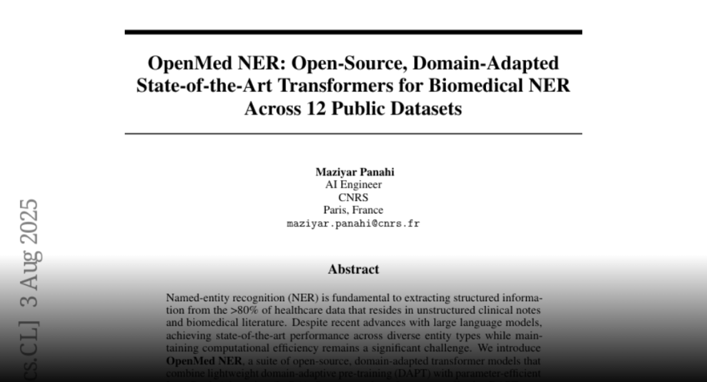 challenge. We introduce OpenMed NER, a suite of open-source, domain-adapted