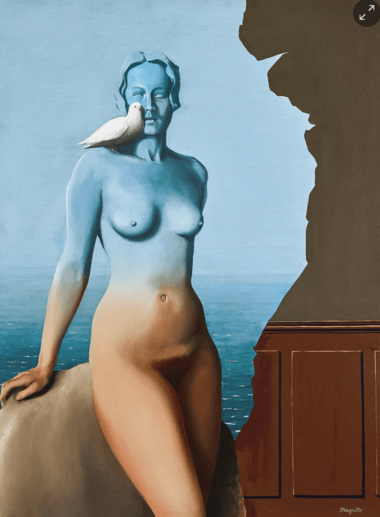 Magritte’s wife, Georgette Berger, is the subject of the oil painting. She is portrayed as a statue, resting her right hand on a block of stone, while the top half of her body blends into the backdrop: a view of the sea (a wood-panelled interior makes up part of the background). A white dove sits on her shoulder. The work is the first of ten portraits that the artist painted in which “the female body is metamorphosed into sky, stone, and spirit,” Sotheby’s said. Magritte wrote in a letter to the French writer and poet André Breton that “to transform a woman’s flesh into sky [is] an act of black magic.”