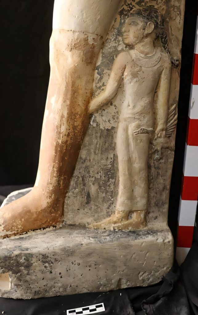 A woman thought to be his wife is sculpted alongside him at a smaller scale—an intimate gesture long interpreted by experts as a sign of loyalty and companionship. Kneeling at his feet with her arm wrapped around his leg, she appears to be wearing traditional attire for in keeping with the Old Kingdom.
