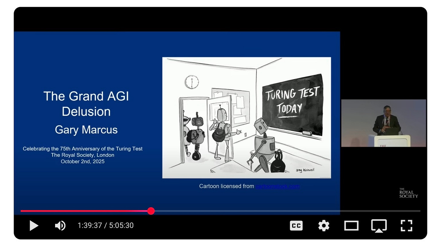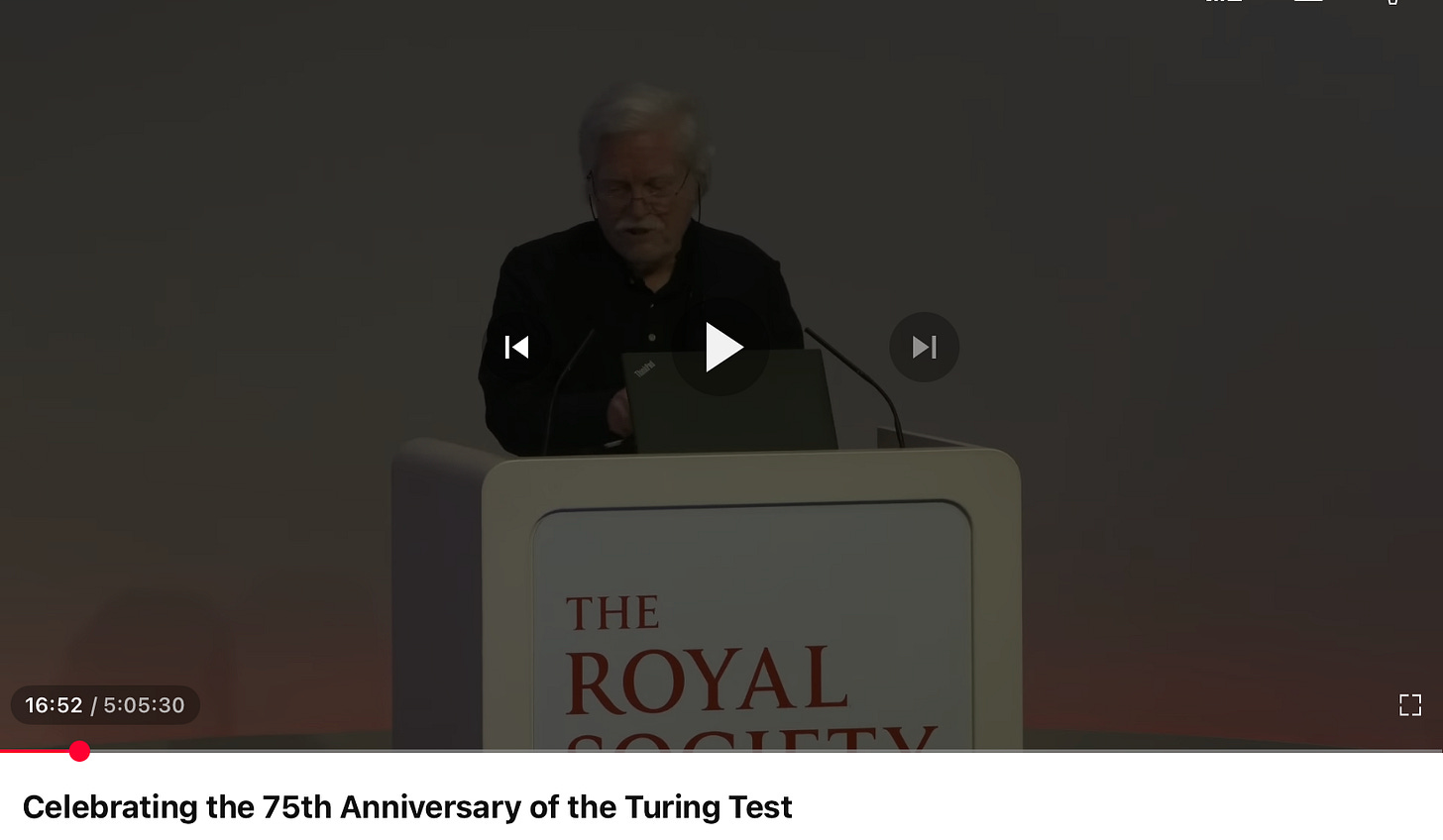 The entire event, co-organized with sublime taste by Dame Wendy Hall and Alan Kay, is well-worth watching; it was one of the best one-day symposia I have ever been to, a deep dive into AI’s impact on society. Watch, for example, for the eviscerating remarks on contemporary AI from Shannon Vallor, a hilarious live reenactment of the absurd variety of tests in the Turing’s original paper, and trenchant closing remarks from Alan Turing’s nephew Dermot Turing. And so much more, all brilliantly observed: