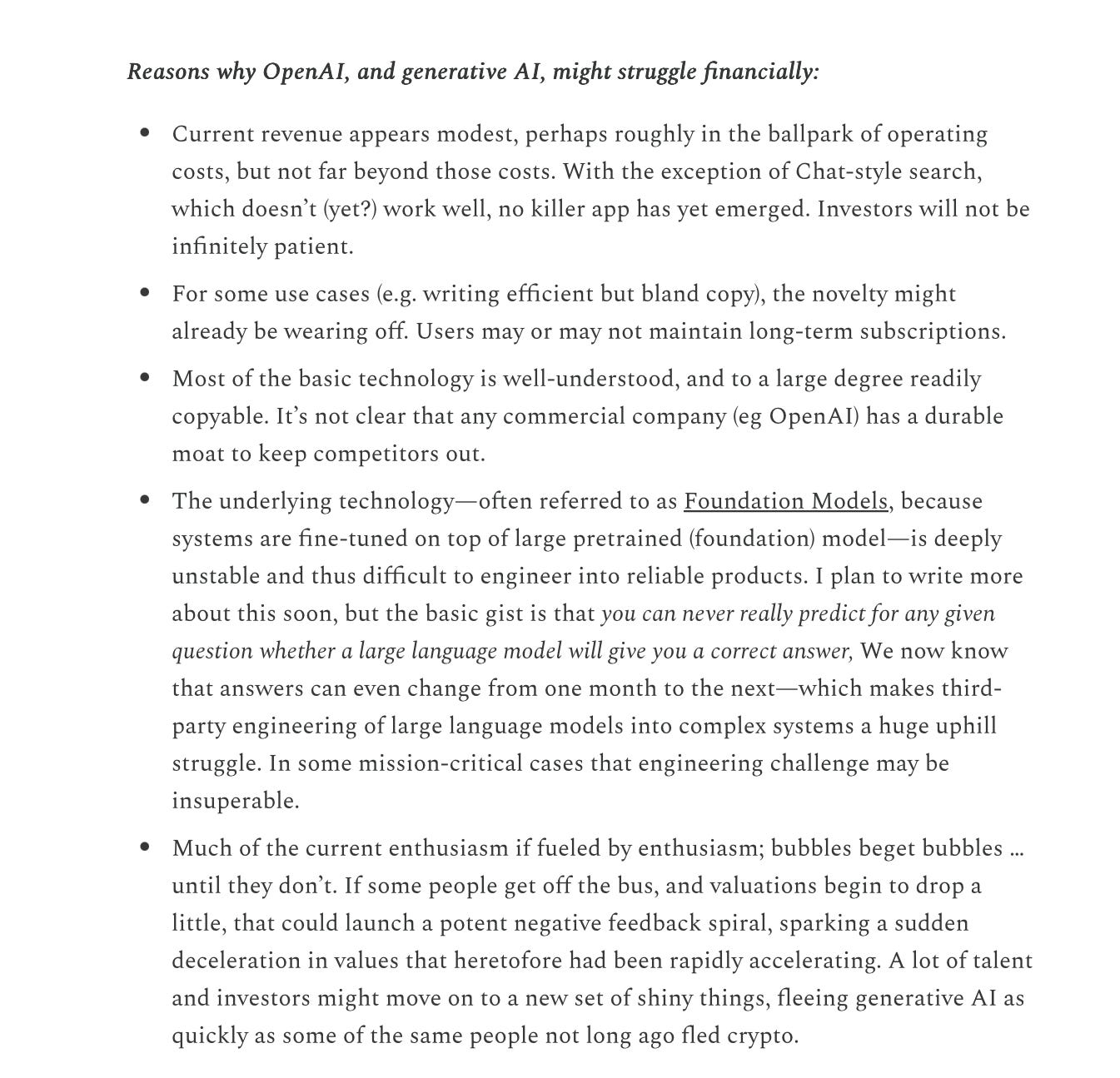 Hard to imagine that he was pleased when I said that scaling would reach a point of diminishing returns and that the economics of large language models were questionable, as in this Substack essay from August 2023, which largely anticipated where we are now: